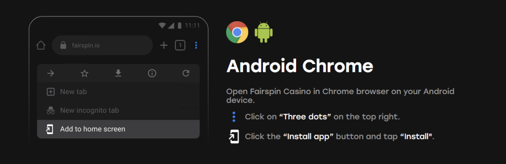 Instalarea pe Android este foarte simplă. Deschide browser-ul Chrome și navighează către site-ul oficial Fairspin. După ce pagina s-a încărcat, apasă pe cele trei puncte verticale din colțul din dreapta sus al browser-ului. În meniul afișat, selectează „Instalare aplicație” sau „Adăugare pe ecranul principal”. Confirmă alegerea în fereastra pop-up. Acum, o pictogramă pentru Fairspin mobile va fi creată pe ecranul tău de pornire și o poți folosi ca pe orice altă aplicație, fără a trece prin Google Play Store.